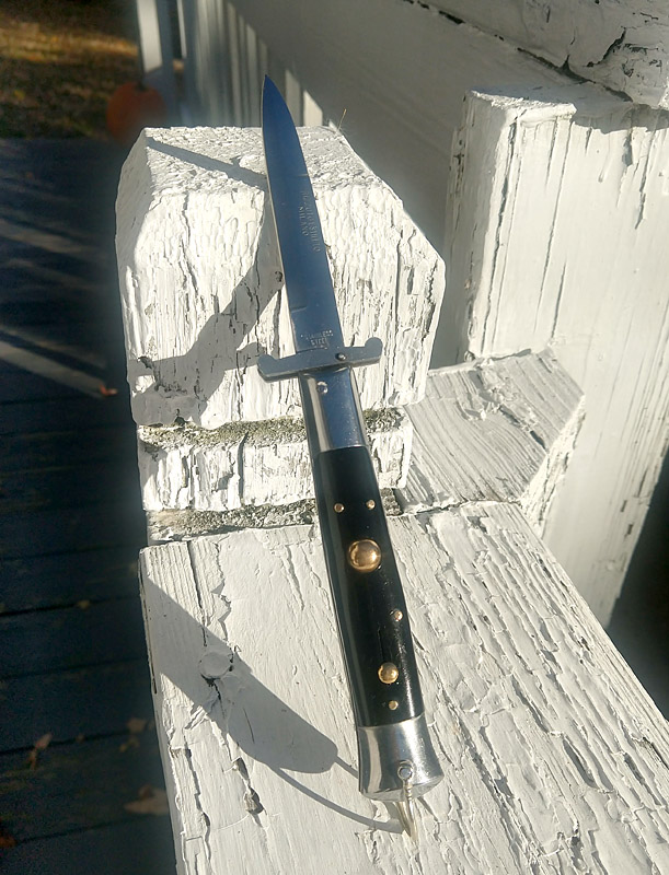 This variation measures 8 inches tip to bale and about 7.5 inches not including the bale. This one has rectangular bolsters and a semi smooth bale. Scales are the acrylic variety. With its brass firing button and safety, this is a stylish first generation rizzuto with a hard to find length.