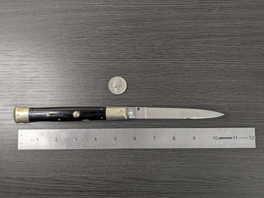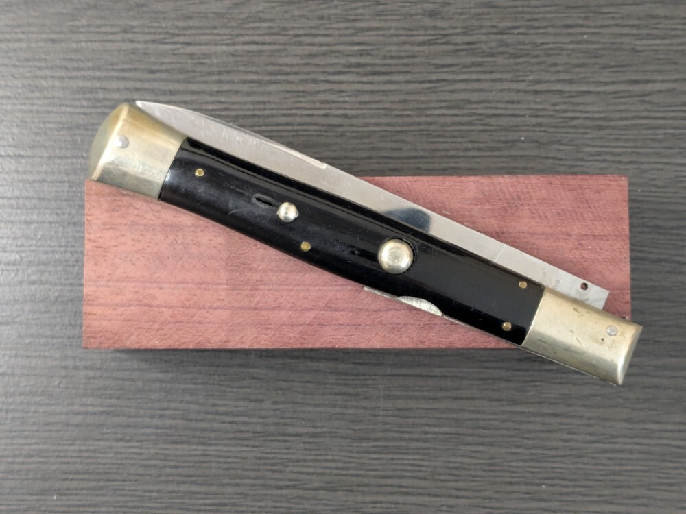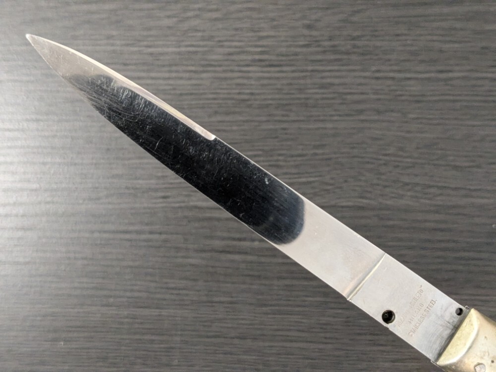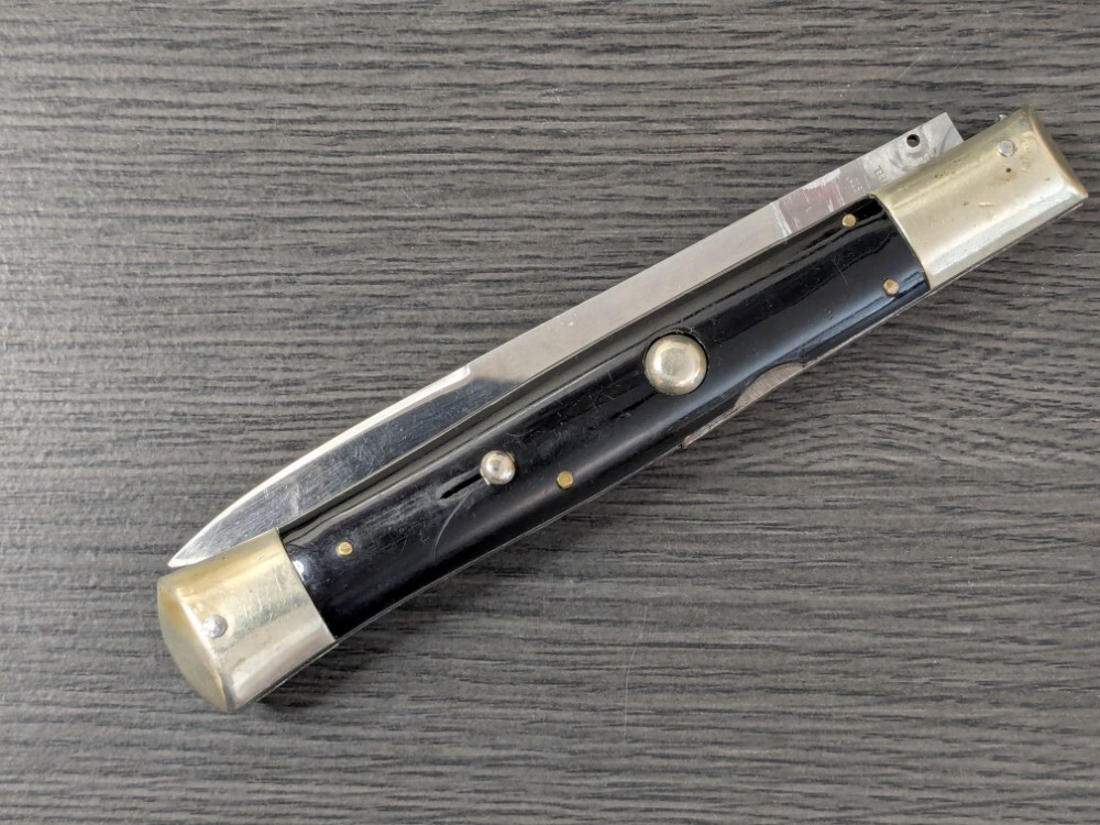 Check this out! Here is what we recognize as a “pre-rizzuto” but has a Rizzuto Estileto Milano tang stamp. This does two things. It shows the pre-rizzuto knives were in fact made in Japan. The REM stamp on the tang also indicates this is where the makers began placing it on the earliest knives. This particular rizzuto is missing its guards which doubtless were the batwing variety like the others of this variation. By virtue of the stamp on this very uncommon knife, one could say this particular one is a rizzuto and not a pre rizzuto.